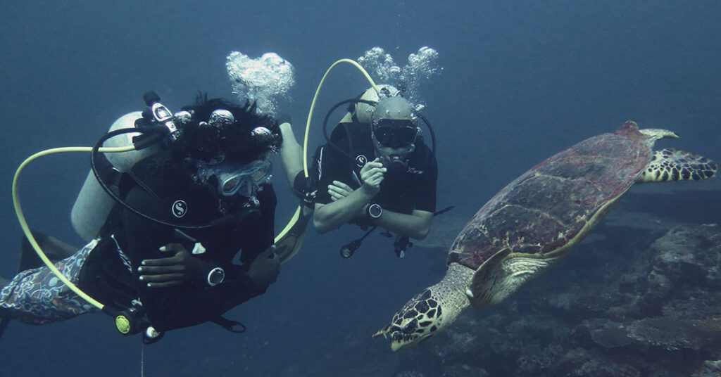 The shallow, crystal-clear lagoon surrounding the island is perfect for beginners and snorkelers of all levels. Our healthy, vibrant house reef is home to stunning corals, turtles, curious eels, and baby sharks. While lounging on the beach, you might be lucky enough to spot dolphins crossing the nearby channels.